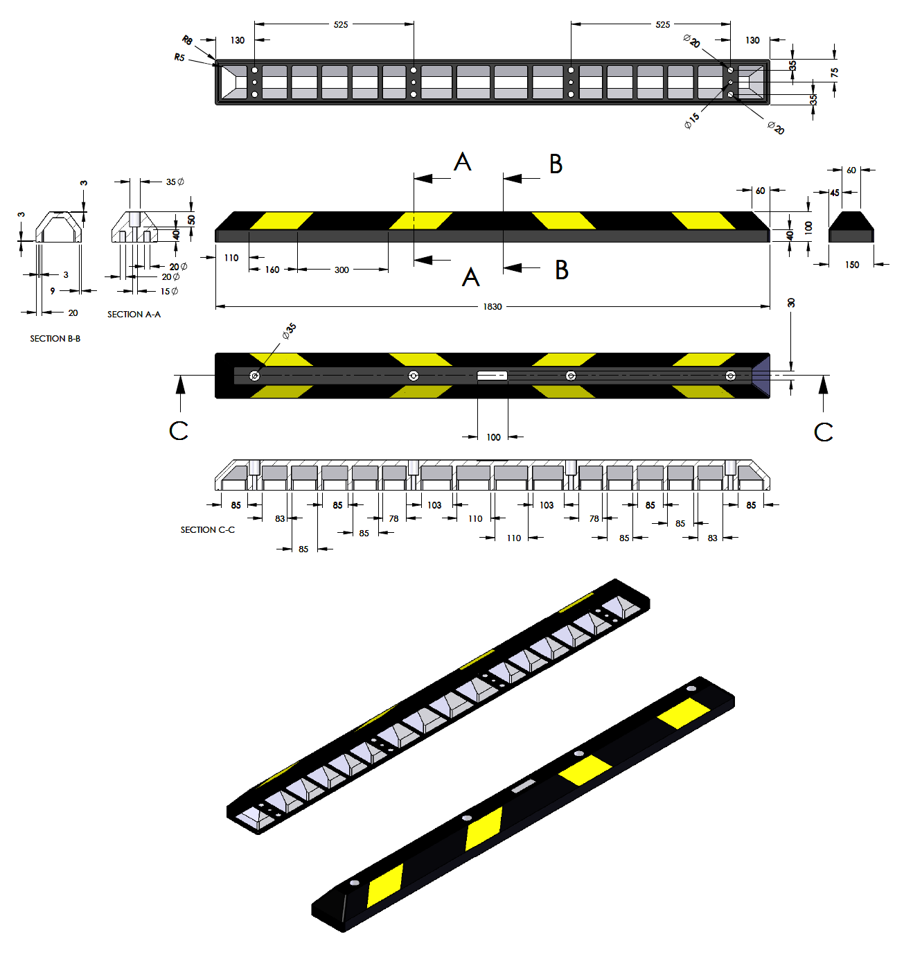 - Durch den Einsatz als Parkschwelle wird auf öffentlichen und privaten Parkplätzen sichergestellt, dass das Fahrzeug innerhalb bestimmter Abgrenzungen bleibt.
